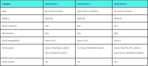 With four Novos on the market, how do you know which one is right for you? We compared the Smok Novo versus the Smok Novo 2 versus the Smok Novo 3 versus the Smok Novo X earlier this year. Here is an overview of the Smok Novo family. As mentioned earlier, the pods for the Novo, Novo 2 and Novo 3 are cross compatible. They all hold 2ml eliquid. And they are all pretty much designed for salt nic.