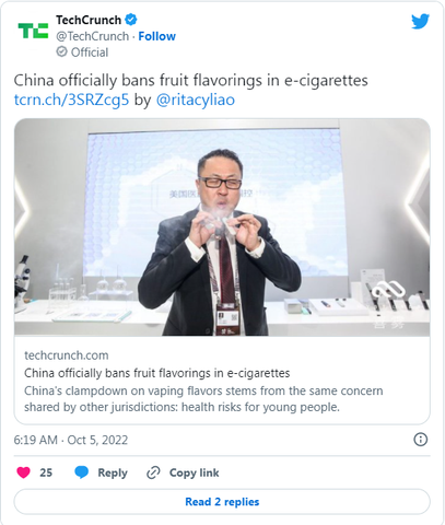 China banning fruit flavorings from vapes is a surprise, given the importance of e-cigarettes to the Chinese economy. But even in China, the perceived threat to young people is enough for the government to take action. As a result, the Chinese vaping industry will soon have the same headaches as the American one, but it will survive since it can still sell to other countries.
