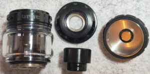 The coils press-fit into the tank, with the tank base that screws on and off the chamber. In terms of airflow, the airflow ring has full stops on either side and has two cyclops airflow holes. This is an airy atomiser for sure; I found myself cutting the airflow down to about half to get to my preferred vape experience and warmth.