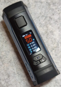 The front of the mod has the fire, mode, and adjustment buttons. It also has a 0.96” TFT colour screen that displays vaping data like mode, wattage/temperature, volts, amps, ohms, puff counter, and battery life in bar and percentage which is always very useful. The screen is crisp and easy to read in low and high lighting situations.